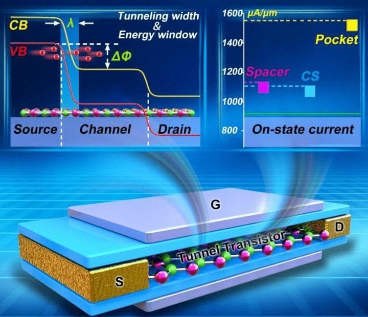 隧道場效應(yīng)晶體管(TFET-Tunnel Field Effect Transistor),和傳統(tǒng)MOSFET晶體管原理不同,在TFET中源極和漏極摻雜不同。它使用量子力學隧道效應(yīng),柵極和源極之間的電壓決定了電荷載流子是否可以“隧穿”通過源極和漏極之間的能量勢壘,以及電流是否可能流動。